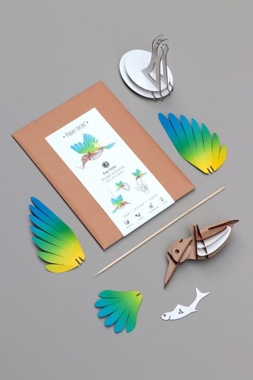 De IJsvogel kit bevat: 1 bruin kartonnen sjabloon voor het lichaam. 1 wit sjabloon voor het lichaam en de standaard Gekleurde vleugels en staart. Een houten spies. Een blad met duidelijke instructies. Je hebt geen schaar of hobbymes nodig om deze papieren ijsvogel zelf in elkaar te zetten!