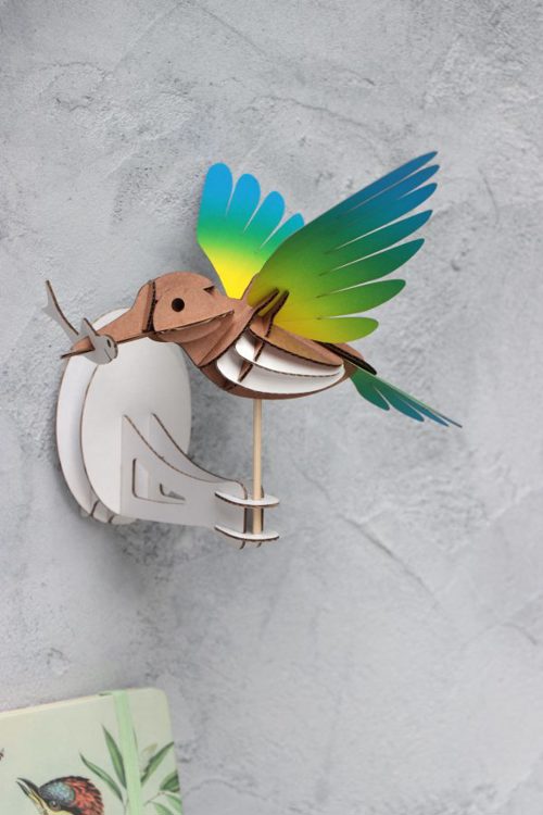 Je kunt nu op een zeer diervriendelijke manier een exotisch vogelparadijs in huis halen. Al onze papieren creaties worden gemaakt met FSC-papier. En dat geldt ook voor deze 3D Papieren IJsvogel. De vogels van Assembli zijn kleine levendig gekleurde huisgenoten om in elkaar te puzzelen en die je muur in no time opfleuren, door je kamer zweven en ritselen in mooie kamerplanten. Het samenstellen van deze 3D Papieren IJsvogel is een creatieve reis. Het voldane gevoel als je klaar bent met het in elkaar zetten van deze prachtig gekleurde vogel is geweldig! De IJsvogel kit bevat: 1 bruin kartonnen sjabloon voor het lichaam. 1 wit sjabloon voor het lichaam en de standaard Gekleurde vleugels en staart. Een houten spies. Een blad met duidelijke instructies. Je hebt geen schaar of hobbymes nodig om deze papieren ijsvogel zelf in elkaar te zetten! Na het in elkaar zetten kun je een paar puntjes lijm toevoegen om je ijsvogel in de meest perfecte vorm te houden, maar dat is niet per se nodig. IJsvogel feiten: De wetenschappelijke naam is Alcedinidae. De meest voorkomende ijsvogel kan 17 tot 19 centimeter lang worden, met een gewicht tussen de 34 en 46 gram en een spanwijdte van 25 centimeter. Wist je dat ijsvogels voornamelijk vis eten, maar ook (water)insecten, zoetwatergarnalen en kikkervisjes. Ze sluiten hun ogen als ze in het water duiken, dus ze vissen blind! Ze buigen hun hoofd voordat ze gaan duiken om de diepte van de vis nauwkeurig te beoordelen. Ijsvogels paren in het voorjaar. Het mannetje zal het vrouwtje benaderen met een vis in zijn bek. Hij houdt het zo vast dat de kop van de vis naar buiten wijst en probeert het aan het vrouwtje te voeren. Als dat niet lukt, eet hij de vis gewoon zelf op. Het kan zijn dat hij dit romantische gedrag een tijdje moet herhalen voordat de paring plaatsvindt. Een ijsvogel paartje graaft een nesttunnel in verticale, zanderige rivieroevers. De nestkamer heeft aan het uiteinde heeft een lichte verhoging om te voorkomen dat er eieren uitrollen.