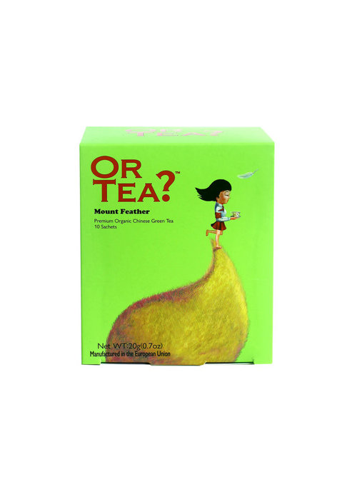 Met een uiterlijk dat wordt gekenmerkt door rechte en strak opgerolde theeblaadjes, wordt Mount Feather alleen in het voorjaar geoogst. "Mount" komt van de bewerkte theeblaadjes, die lijken op de bergtoppen van een schilderij met Chinese inkt. "Feather" verwijst naar de glans van de witte haartjes, die de theeblaadjes bedekken voordat ze worden bewerkt. Deze thee is erg populair bij liefhebbers van groene thee en staat in China bekend als één van de tien beste theesoorten. 10 biologisch afbreekbare theezakjes per stuk verpakt.