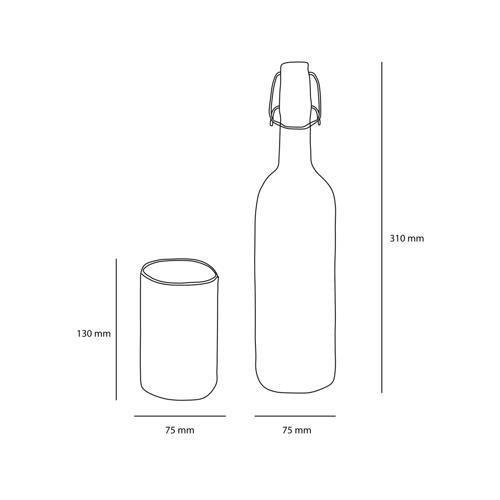 Deze set bevat 1 waterfles met 2 upcycled glazen. Deze glazen fles is voorzien van een hersluitbare dop. Spoel de fles met warm water en laat hem omgekeerd drogen, zo geniet je telkens weer opnieuw