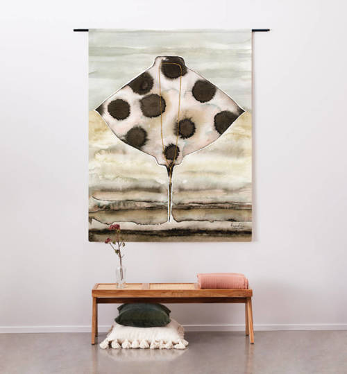 The beauty of this design lies in the simple but so authentic shape of it. Animals found in the sea which are very recognizable by the abstract form of their body shape. The background gives the illusion of water, by using earthy tones and a crackle paste for texture.