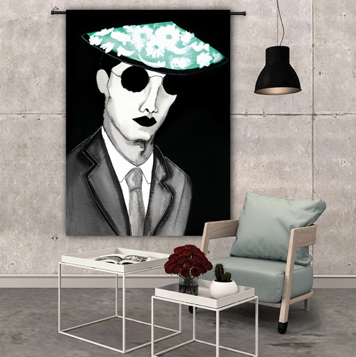 Dit ontwerp is geïnspireerd op een look van Thom Browne. Het mooie aan modeontwerp vind ik dat het gaat om het creëren van karakters. Het werk van Thom Browne kan zo in een film. Material Cotton Velvet Size 177cm x 130cm