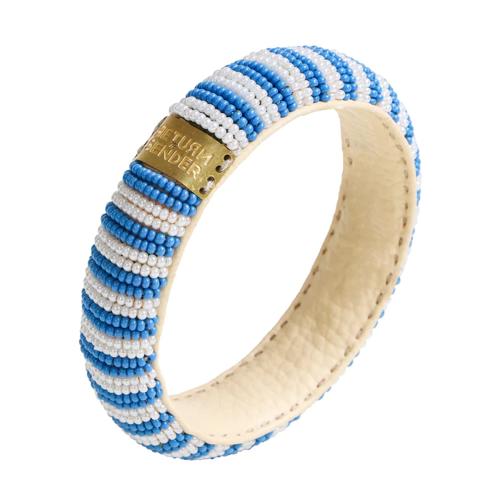 Deze handgemaakte wit met blauwe armband uit Mali is stoer en toch vrouwelijk, met een uniek gestreept design. De gestreepte armband is van skai (nepleer) en kralen gemaakt. Met deze blauwe armband maak jij je outfit helemaal af! Ontworpen door Laura de Monchy - echt Dutch design! Afmeting: 2,2 cm brede armband met kralen, diameter tussen de 6,5 en 7 cm.